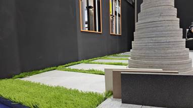 其后,設計感十足的產品陳列墻、呈現多種生態石英磚鋪貼方式的展位地臺、靈動唯美的高端花色樣磚如畫作般展示于墻......讓產品肌理與植物、鵝卵石還原了真實的花園庭院環境,使蒞臨者皆能身臨其境,打破固有束縛,享受冠源塑造的極富自然氣息的生態感,實現了人與自然空間的多維互動、和諧共存。